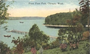 Priest Point Park, located about a mile north of downtown Olympia, has a colorful history. The forested area and beach were once the site of an Indian village. Then came the European and American explorers, fur trappers and American settlers in 1845 and 1846. In 1848 an Oblate Catholic mission, which lasted until 1860, was established on the site . Developers took over for many years with big dreams that finally fizzled by the turn of the century. In 1905, the City of Olympia resolved the real estate controversy and purchased 240 acres and a mile of waterfront for a public park. Local residents rallied to donate labor to clear pathways and build a park – a family park for all ages to enjoy.