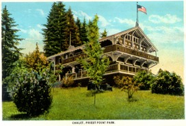 Priest Point Park was historically noted for its two-story, green and white chalet facing west toward the water. The Swiss-styled building was the gift of Leopold Schmidt in 1905. The building had been part of the Olympia Brewing Company display at the 1903-04 Lewis and Clark Exposition in Portland.