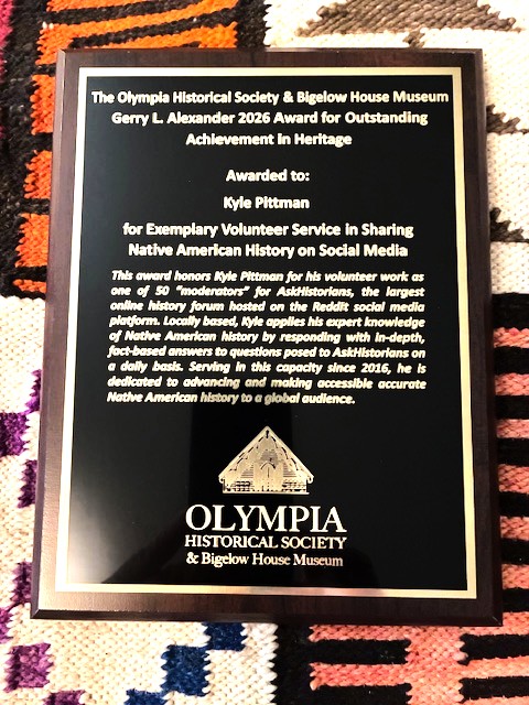 While his teaching for the Native Pathways Program is admirable enough, this award is about honoring Kyle’s voluntary work since 2016 as a “moderator” for the AskHistorians thread, or on-line “public history forum” on the Reddit social media platform. For those of you, like me, who are not familiar with Reddit, it is described as a “collection of diverse communities where users can discuss a wide range of topics, share content, and connect with others. These communities act like forums where users can post questions, share information, and engage in discussions related to that topic.” The AskHistorians thread, community, or “subreddit” as it is called, is one of the largest such communities on the platform with two million subscribers from across the globe. As stated on the home page, AskHistorians “aims to provide serious, academic-level answers to questions about history.” They have posted pages of rules and guidelines that support this aim and maintain the high standard of discussion AskHistorians has become known for.” Of Nez Perce heritage and raised on the Puyallup Reservation, Kyle’s expertise, education, and experience with Indigenous law, governance, and policy, makes him well-qualified to work as the only Native American moderator who often responds to questions touching on Indigenous history and culture in North America and handles moderation issues regarding these topics. Aside from teaching and writing 8 to 10 hours each week for AskHistorians, Kyle also moderates the Indian Country subreddit with 90,000 subscribers and which he describes as an “Indigenous-centric space for people to talk about Native American issues.” Devoting nearly 30 hours each week to AskHistorians and Indian Country, Kyle says “To me, its public service…It takes a lot of work to harness the benefits of an online media platform to have honest intellectual discourse.” He goes on to describe the site as a “controlled environment. We work from a set of values that we believe are good and positive. We embrace diversity, inclusivity, accessibility, speaking truth to power, and conformity to what is factual.”