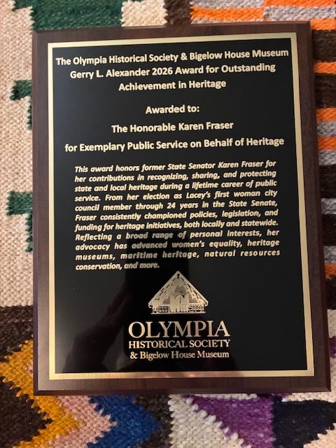 Born in Seattle and educated at the University of Washington, Karen’s FORTY-THREE YEARS in elected office speaks volumes about her stellar record in public service. In her first run for office, she was elected as the first woman to serve on the Lacey City Council and subsequently elected as first woman mayor. After a stint as a Thurston County Board of Commission member, Karen went on to the statehouse, being elected twice to the House of Representatives followed by six 4-year terms as State Senator serving the 22 nd Legislative District. Throughout her career, both in public office and in her personal life, Karen has been a strong, consistent, and effective voice for honoring and preserving heritage, the arts, and culture. Her leadership has fostered the creation, sustaining, and expansion of heritage organizations and facilities both locally and across the state beginning with her initiative as Mayor to create the Lacey Museum (that continues to thrive in a newly opened expanded museum space).
