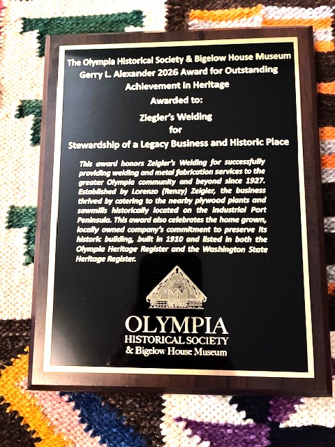 The award for Zeigler’s Welding recognizes and honors the company’s nearly 100 years of providing top quality welding and metal fabrication services to the community. It also celebrates Zeigler’s stewardship of its landmark headquarters building that evokes Olympia’s industrial past.