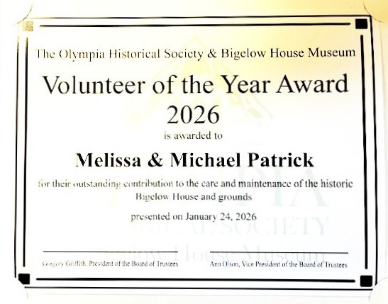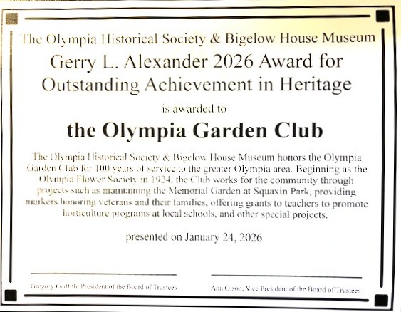 Starting with 25 members, today it is a growing organization with over 120 women and men who share an avid interest in gardening, landscape design, civic improvement, the study of horticulture, conservation and flower arranging. Quoting their Mission Statement, “Olympia Garden Club provides education, resources, and networking opportunities for its members to promote gardening, floral design, civic and environmental responsibility.” In carrying out that statement, their club projects include such things as educational scholarships and awards to Thurston County teachers, the Thurston County Fair Flower Show, Gold and Blue Star Markers at Squaxin Park, several gardens at Squaxin Park including a Memorial Garden, a national TREX Bench Challenge program, Plant-A-Tree projects, and their traditional Merrie Makings of creating wreaths, centerpieces, and other items during the holidays to name a few. Would the Olympia Garden Club President Tara Keen please come forward. It is my honor to present this Olympia Historical Society and Bigelow House Museum 2025 Gerry L. Alexander Certificate of Award to the Olympia Garden Club in recognition of 100 years of community building and service. Congratulations!!