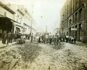 Looking Back’s theme for 2026 is Downtown by the Decades. The early 20th century brought demands for better road surfaces for bicycles and early automobiles. In 1909 the city finally paved Fourth Avenue, with workers taking a moment to pose for their photograph, and spectators looking on. Image selected and captioned by Deborah Ross on behalf of the Olympia Historical Society and Bigelow House Museum, https://olympiahistory.org.